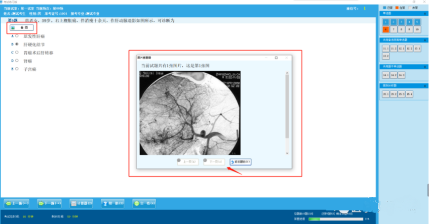 ①答题页面图片显示可能是医学影像、心电图、脑电图、病理切片或实物图片等等。作为答题的参考资料,当屏幕右下方提示可调用图片时,用鼠标点击或按相关键即换屏显示图片。