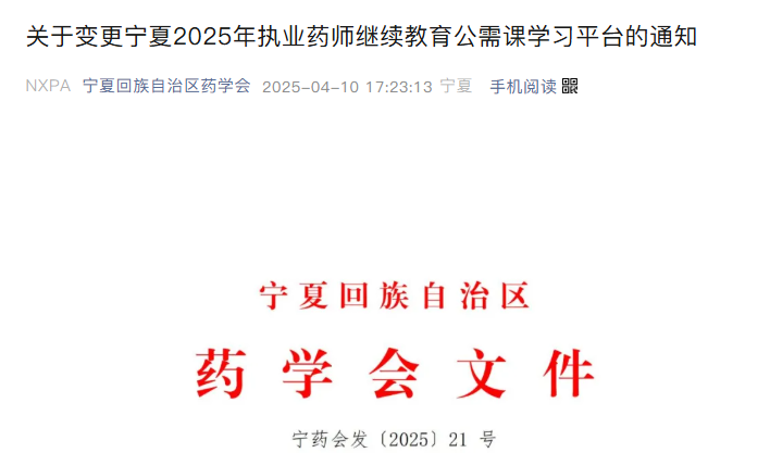 自2025年起,宁夏执业药师继续教育公需课的学习平台由原先的宁夏回族自治区药学会官网,调整为宁夏回族自治区人力资源和社会保障厅“宁夏专业技术人员继续教育培训网”。