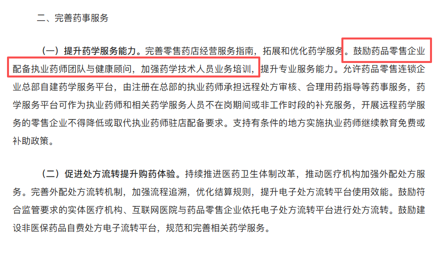 1.鼓励药品零售企业配备执业药师团队与健康顾问,加强药学技术人员业务培训,提升专业服务能力。