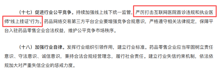 促进行业公平竞争。持续加强线上线下统一监管,严厉打击互联网医院首诊违规和执业医师“线上挂证”行为。